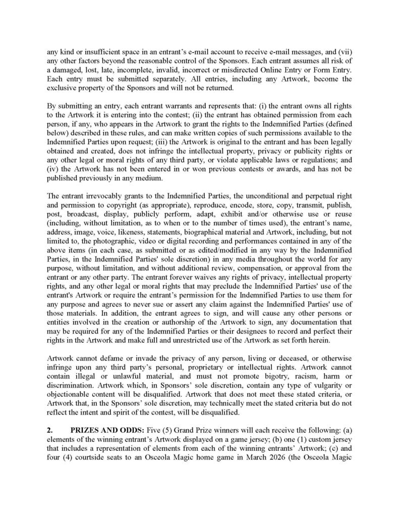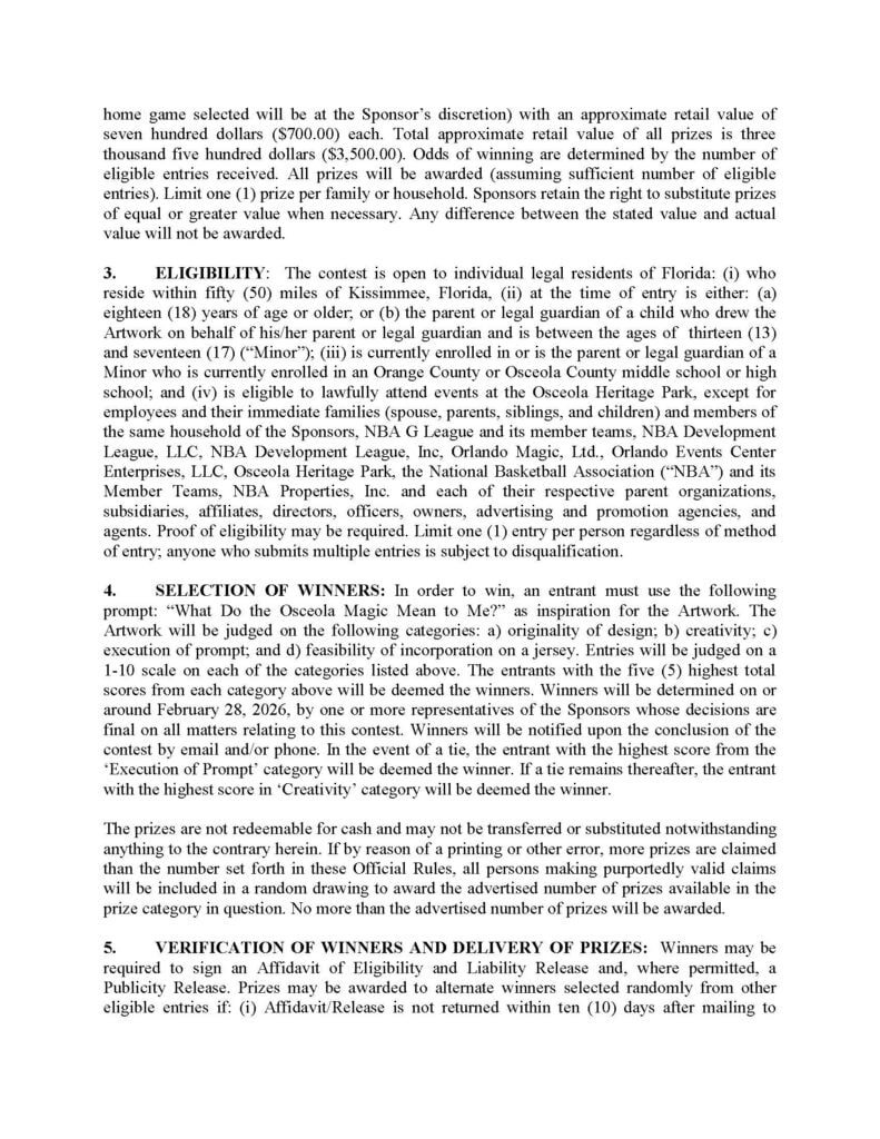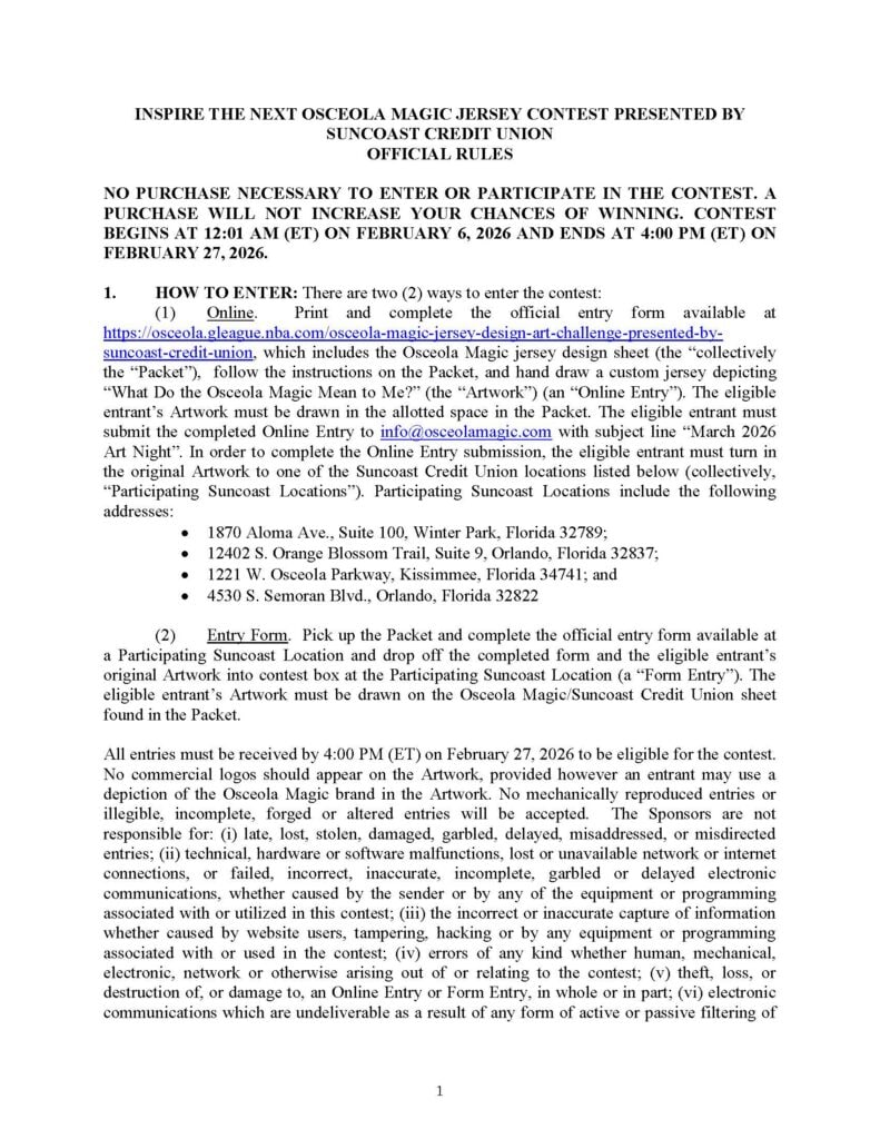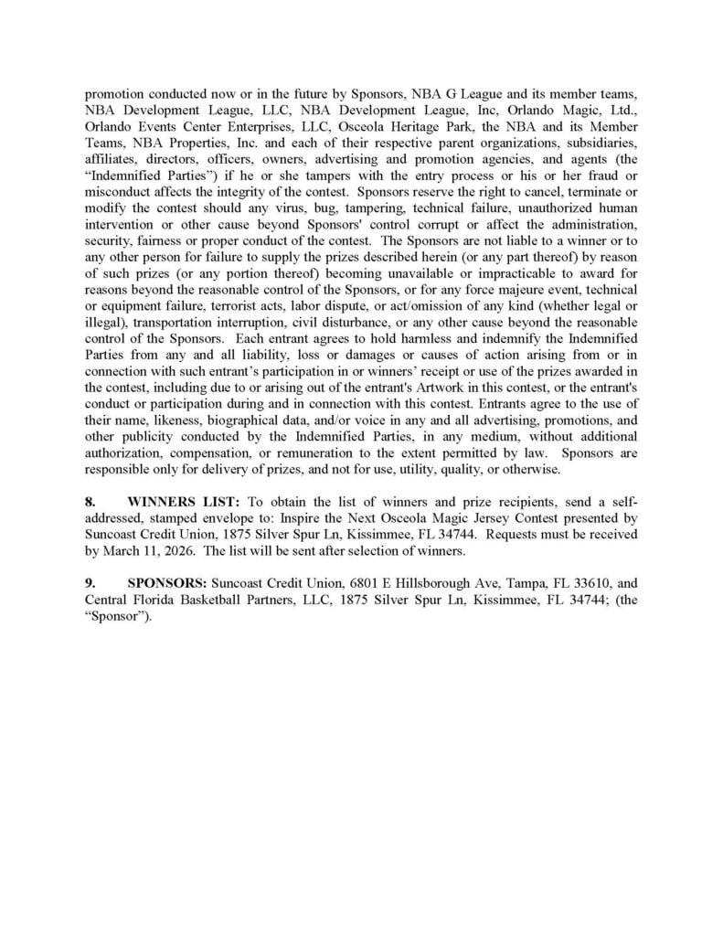 Inspire the Next Osceola Magic Jersey Contest Presented by Suncoast Credit Union (OFFICIAL RULES)