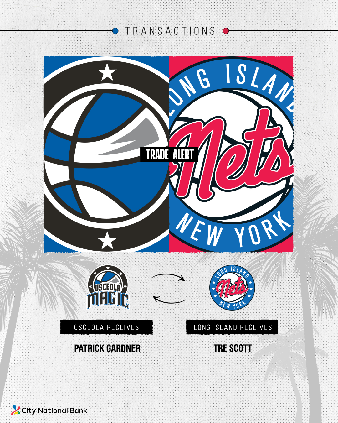 KISSIMMEE, Fla. (Dec. 26, 2024) - The Osceola Magic have acquired center Patrick Gardner from the Long Island Nets in exchange for forward Tre Scott, General Manager of Osceola Magic Kevin Tiller announced today.