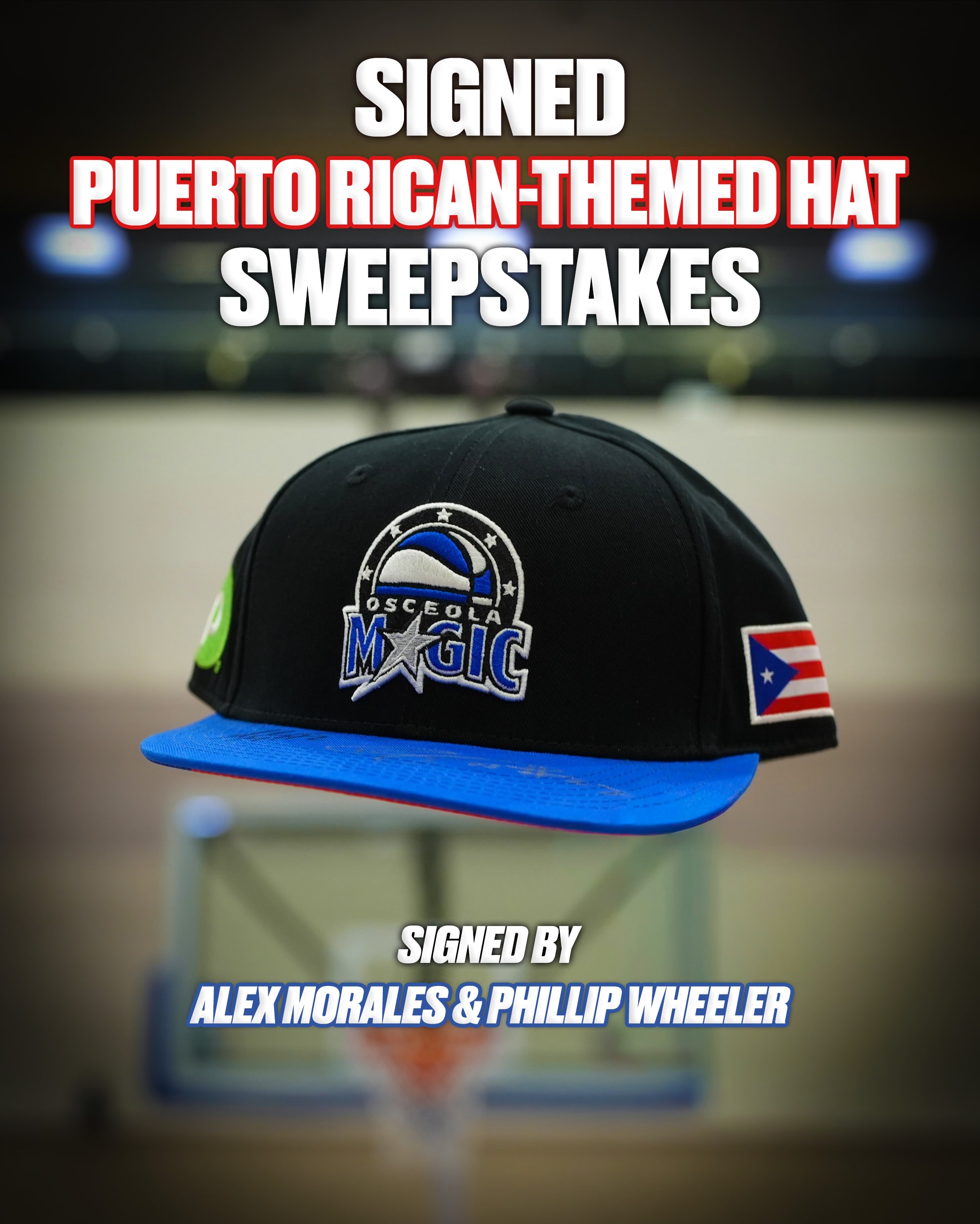 Signed Puerto Rican Themed Hat Sweepstakes is operated by Central Florida Basketball Partners, LLC. No purchase necessary. Entry Period: November 5, 2025 – November 30, 2025. Sweepstakes is only open to legal residents of Florida who live within a 50-mile radius of Kissimmee, Florida, entrant must be 18 years or older. Void where prohibited. Visit https://osceola.gleague.nba.com/november-2025-sweepstakes-rules for full Terms and Conditions.